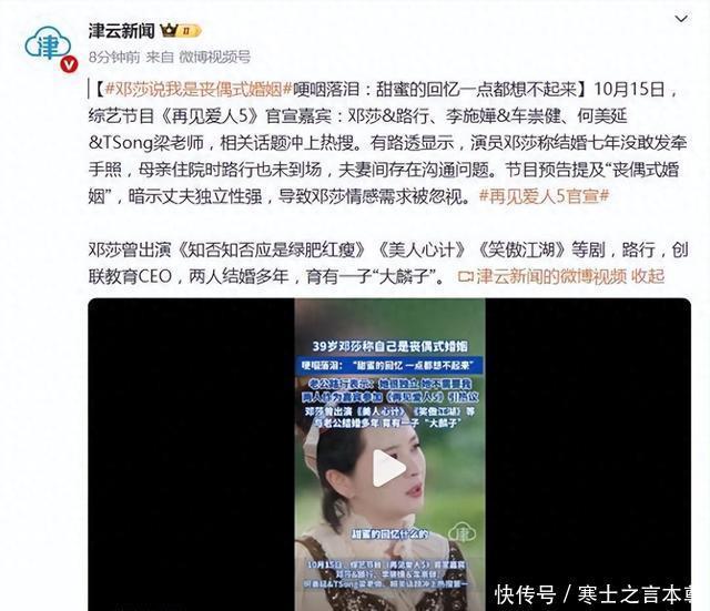 《再见爱𱍉》开播了,第一时间就去找了节目来看。果然啊,三对夫妻(其中一对只是情侣关系)各有各的抓马。我印象最深的是邓莎和路行这对。 邓莎是一个年轻时曾一度小红过的女演员,上升期跟林心如合作了《美人心计》,跟霍建华合作了《笑傲江湖》。 路行是一个拥有百家公司的老板,也就是纯纯的富豪,比邓莎大岁,今年邓岁,路岁。 来节目是邓莎的主意,她觉得现在的生活不是她要的,尤其是他们夫妻之间很冷漠,老公路行经常不在家,平时她负责照顾小孩和自己收养只狗。 结婚多年,夫妻之间连正常的生活都没有,更别提那些路行作为一个丈夫对自己的嘘寒问暖,所以她拉着老公上了节目,表达自己的困惑,看看怎么改变他——不过仅就第一期而言,他们之间的问题的确很严重,可是她的诉求并不十分明显。 因为“怎么改变他”这是我个人概括的,并没有能从邓莎的嘴里说出来。